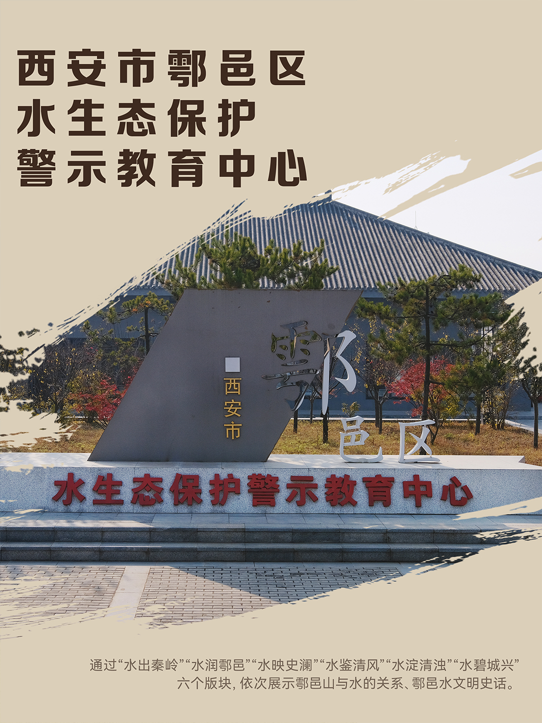 鄠邑区水生态保护警示教育中心于2023年2月建成,展厅面积450平方米。通过“水出秦岭”“水润鄠邑”“水映史澜”“水鉴清风”“水淀清浊”“水碧城兴”六个版块,依次展示鄠邑山与水的关系、鄠邑水文明史话,用鄠邑区内近年来查处的破坏水生态环境典型案例和负面清单,以案为鉴、以案示警,旨在教育引导广大党员干部群众深入贯彻落实习近平总书记关于黄河流域生态保护和高质量发展的重要指示精神,改进作风、统一思想、凝心聚力、扎实苦干,用实际行动践行新发展理念,争做护山保水的“排头兵”。